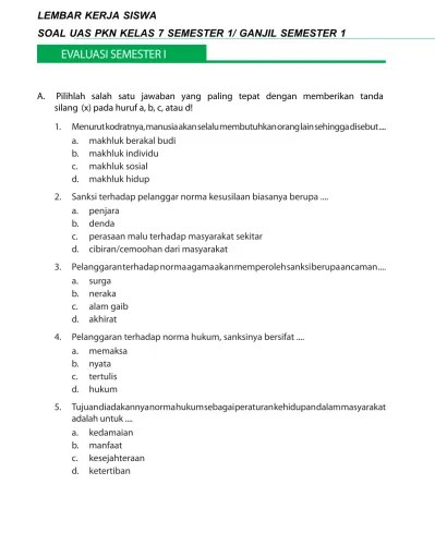 Jawablah dengan cara memilih kunci jawaban yang menurut kalian anggap benar dan tepat. soal uas pkn kelas ii semester 1 www.juraganles.com. Pilihlah salah satu jawaban yang paling tepat. Jun 10, 2021 | total attempts: Yang membantu bupati dalam urusan sistem pertahanan dan keamanan wilayah adalah. Contoh soal semester genap aqidah akhlak kelas 7 mts tanggal agama membaca. Penilaian akhir semester (pas) atau ulangan akhir semester (uas) diberikan untuk mengetahui daya serap siswa dan siswinya dalam belajar selama satu semester atau 6 bulan sekali. Hide 1 contoh soal pkn kelas 11 semester 1 1.1 bagian kedua soal pancasila dan kewarganegaraan … Jika ingin mendownload soal ini, berikut linknya : soal ukk/ uas kelas 1 pkn semester 2/ genap.soal latihan ulangan kenaikan kelas mata pelajaran pendidikan dan kewarganegaraan kls 1 tahun ajaran 2016 2017 sesuai dengan kurikulum ktsp dalam bentuk pilihan ganda 25 soal dan isian 5 soal. Contoh soal tentang ham kelas 11. Camat, kapolsek, dan kapolri b. soal uas pkn kelas 1 sd semester 1 (ganjil) 25 questions | by catherinehalcomb | last updated: